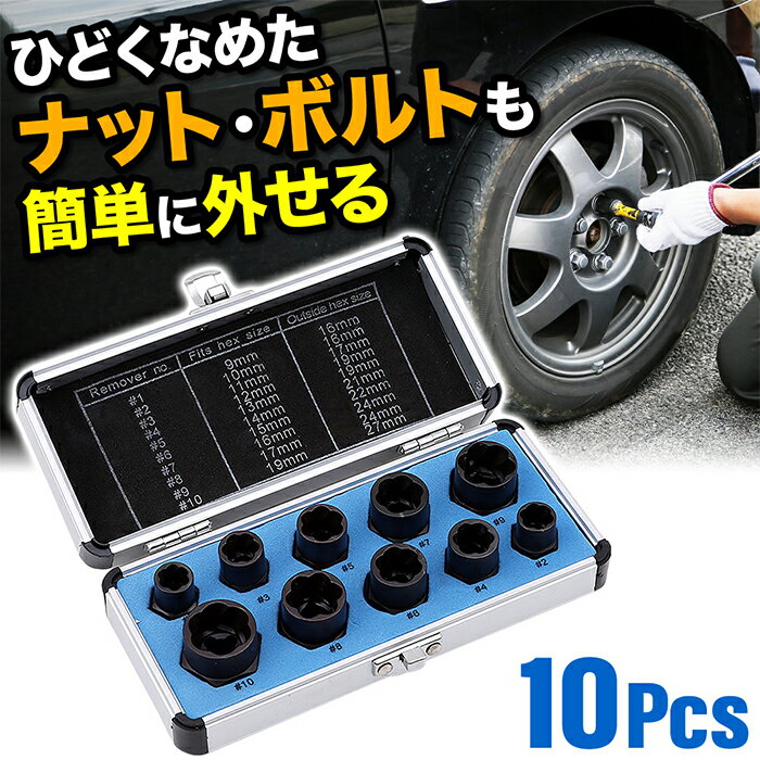 ひどくなめたナットやボルトも簡単に外せる ナットツイスターセット 9〜19mm 10本セット 特殊なツイスト形状が完全に角が潰れてしまったようなボルトやナットは 回せなくなることがあります。